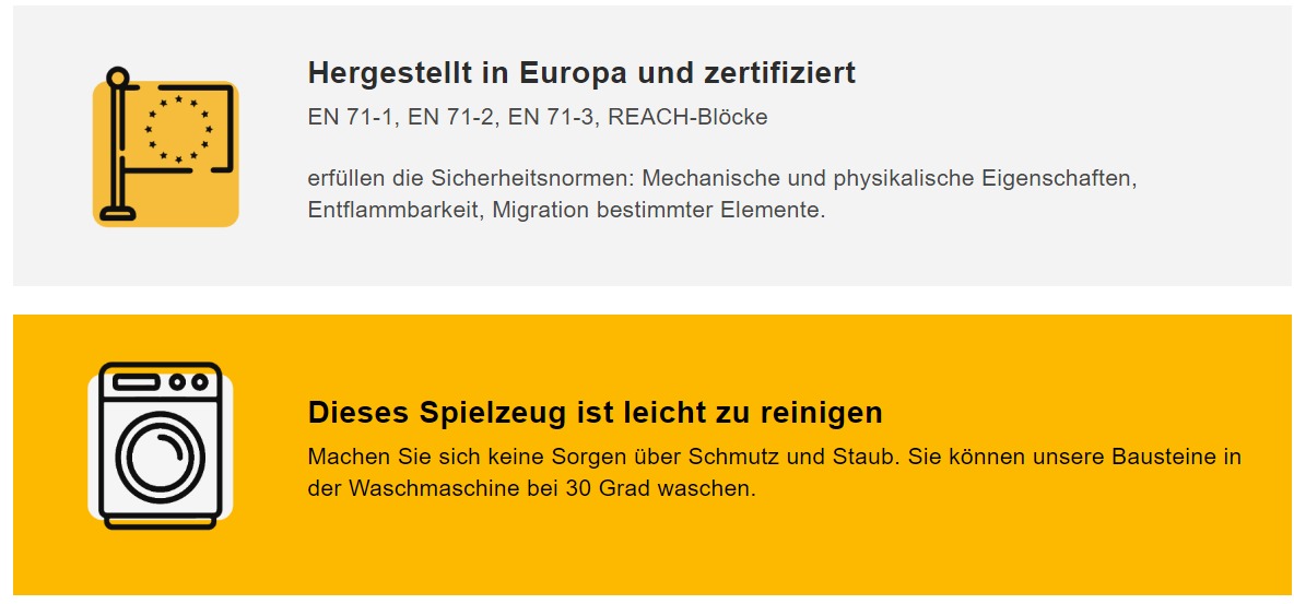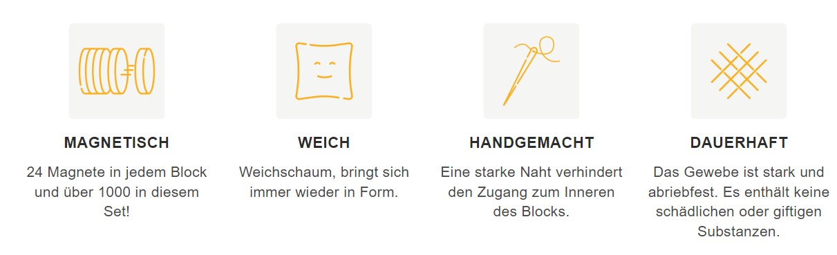 Jeder Würfel verfügt über nicht weniger als 24 starke Neodym-Magnete, die sich abwechselnd in der Polarität anziehen. Dadurch bestehen die Sets auch aus 2 Farben, damit die Kinder erkennen können, wie die Blöcke zusammenpassen.