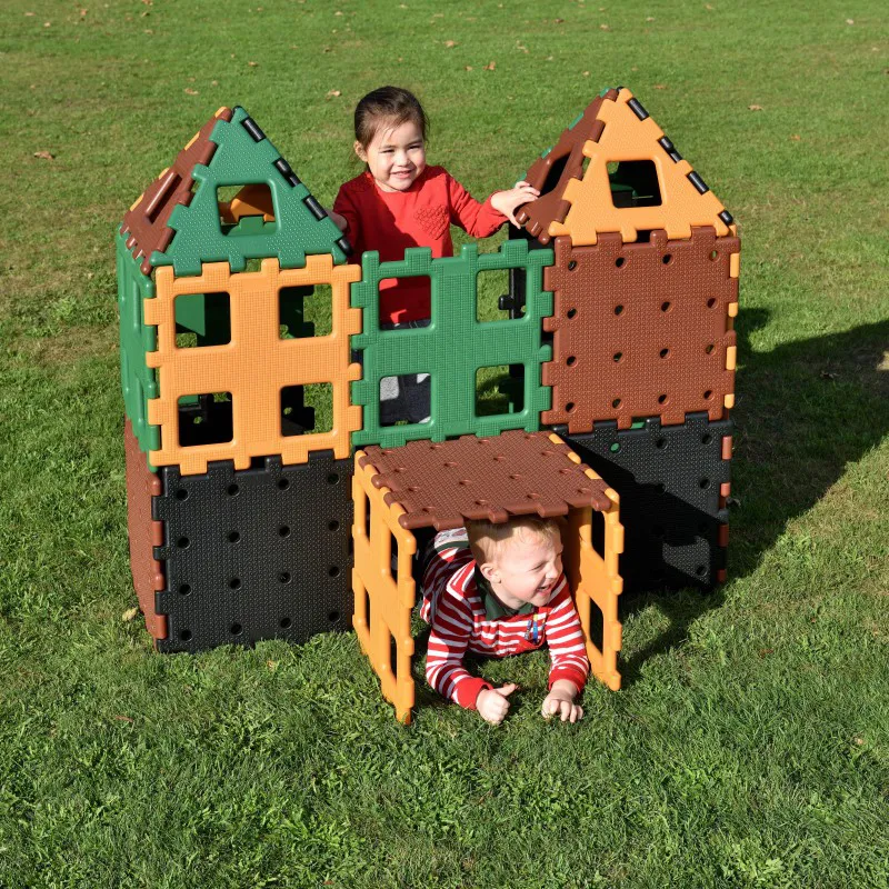 Al trabajar con otros niños mientras construyen, aprenden sobre las formas, el pensamiento bidimensional y tridimensional y la construcción. El juego de roles y el trabajo en equipo también entran automáticamente en juego. Tienen que trabajar juntos para construir su propia estructura.